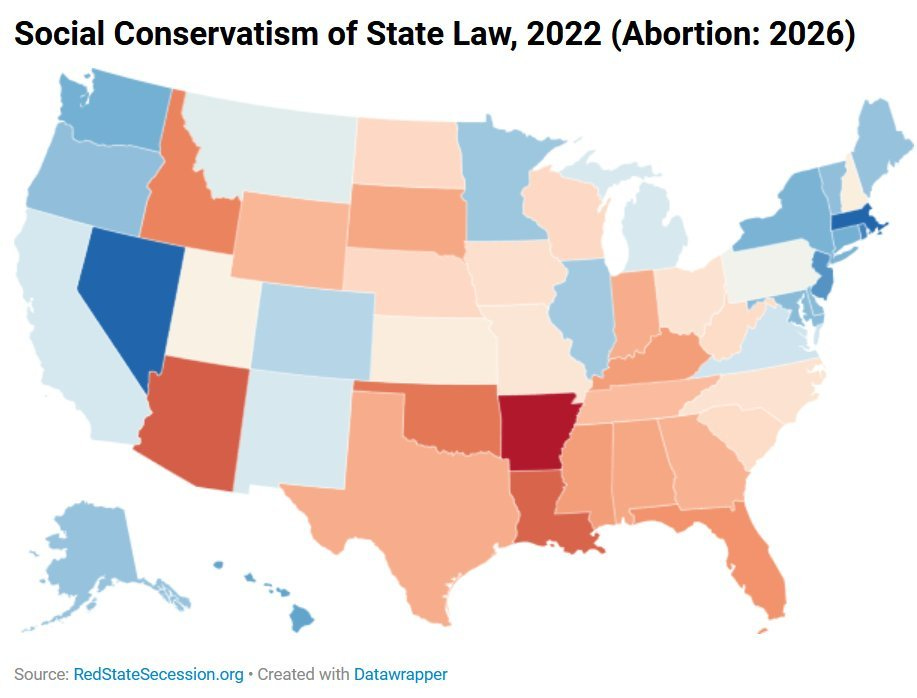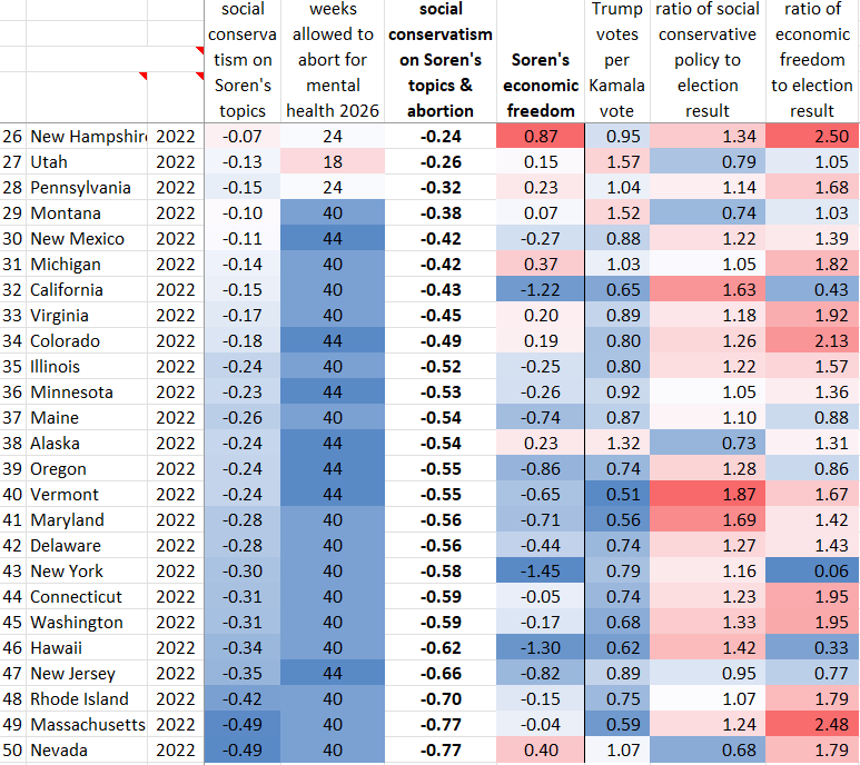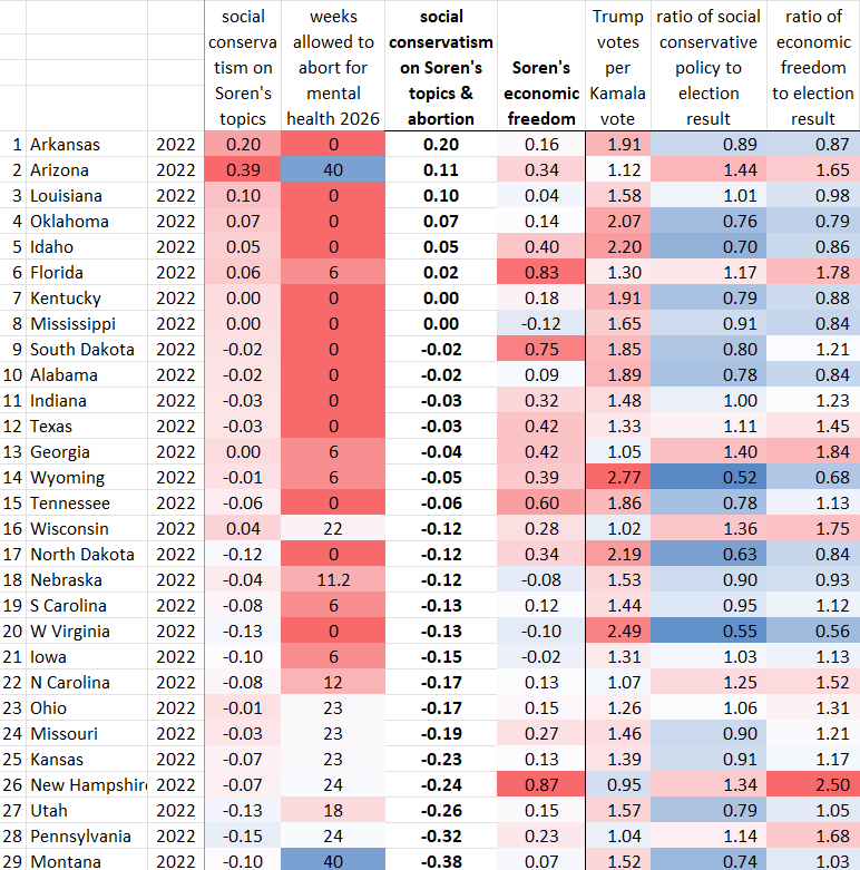 Their spreadsheet is available at their site. I reversed the signs of some of their measures & changed some of the weights, to make their “personal freedom” index into a “social conservatism” index. Then added 2026 abortion status. I didn’t change their economic freedom index.