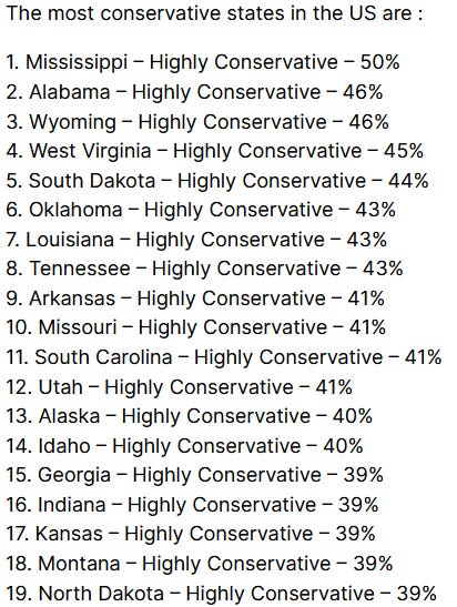 What’s the most conservative state? Only a review of hundreds of laws can answer that, because election results only tell you how easily the GOP wins elections in your state, not how conservative your state laws are. Fortunately, that was done by a couple of libertarians using 2022 data. We modified their “personal freedom” index to show conservatism instead. We also updated the abortion status to 2026. We did not modify their “economic freedom” index, because it is the same as economic conservatism, fiscal & regulatory.