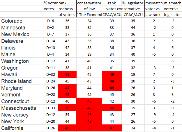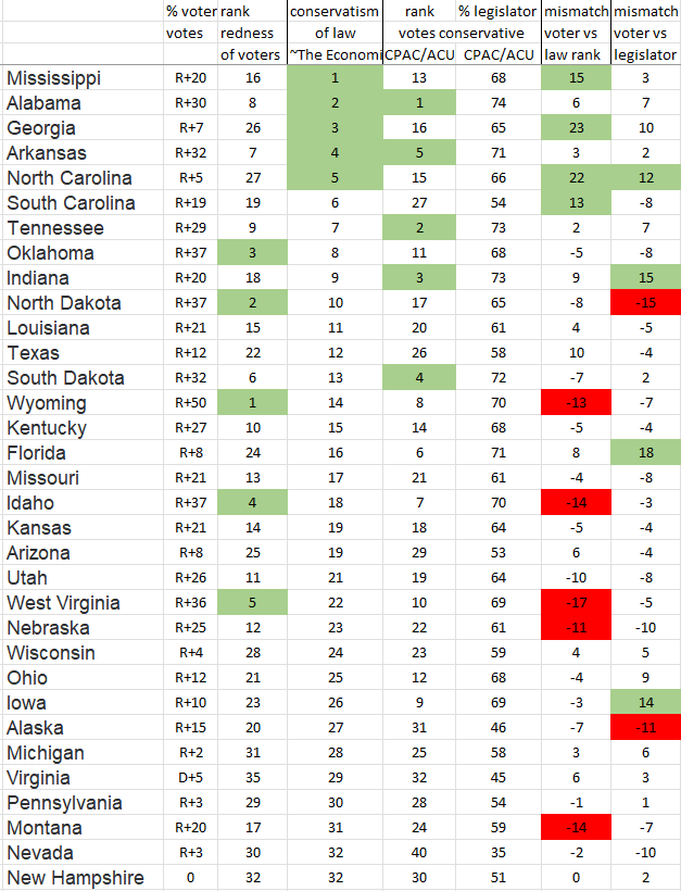 Wyoming, North Dakota, & West Virginia hardly have any Dems in their state legislatures, yet they’re weak on delivering conservative state law. Look at the ratio of conservative law to GOP election results in the right-hand columns. Those 3 states are blue (weak) there. All 3 graphs above graph the 2 middle columns of this spreadsheet.