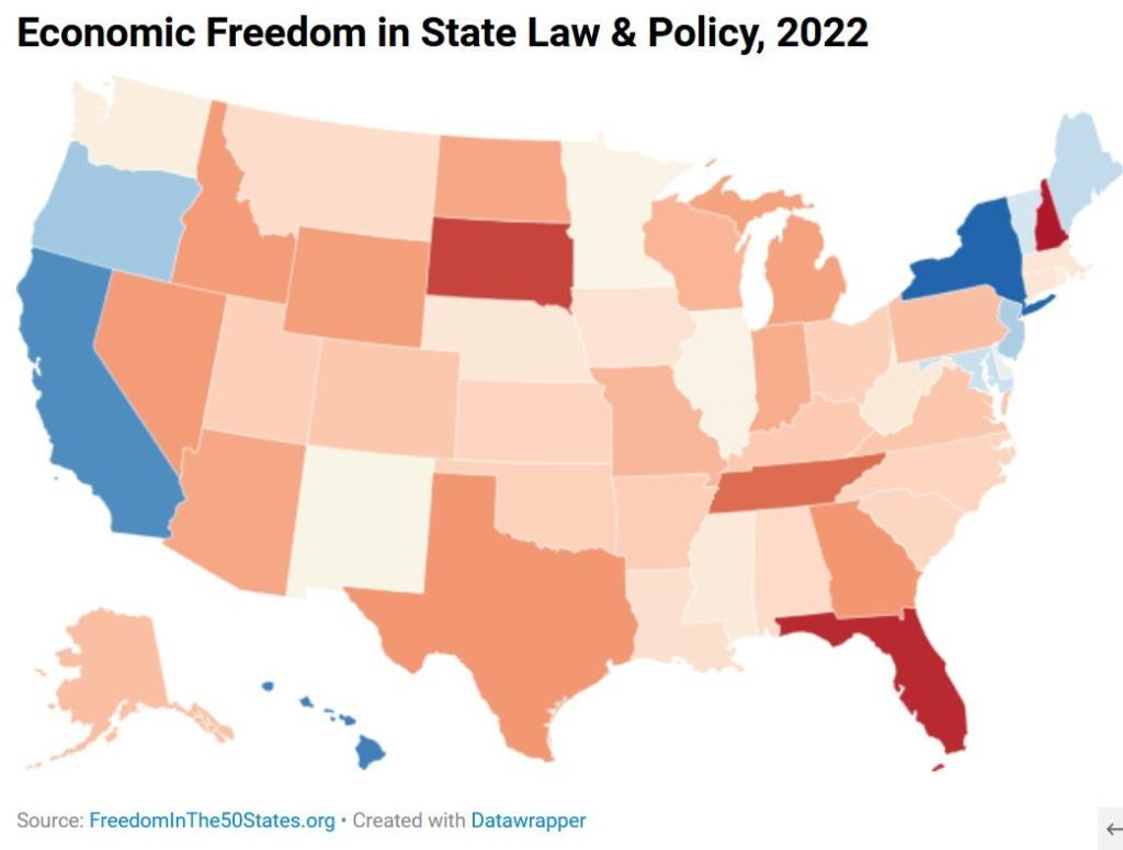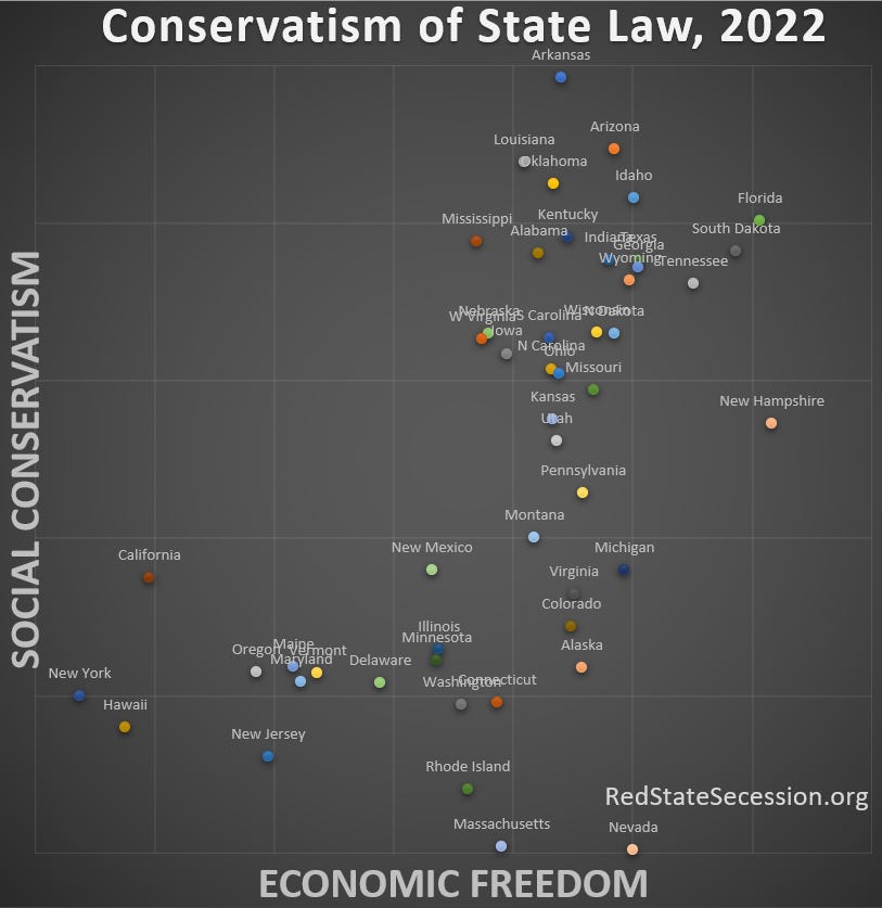This analysis is not nearly as conclusive as I’d like. The only laws or policies considered are the ones libertarians chose for their “Freedom in the 50 states” website. It focuses on individual liberty, not states’ rights or civilizational health.